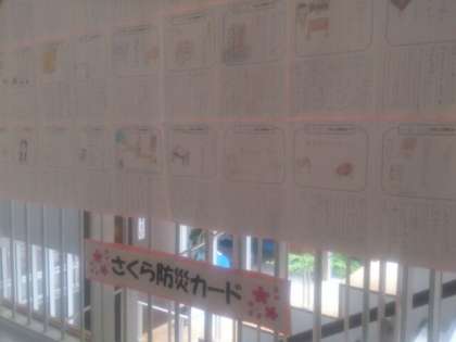 1学期に5年生が、国語の学習で学んだ防災に関する自分の考えをカードにまとめたものが、体育館前に展示されています。