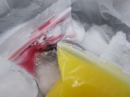 ジュースを袋に入れ、それをさらに氷の入った袋に入れました。