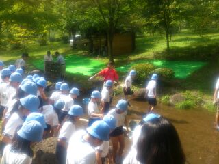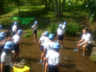 宿舎前の川でマスつかみに挑戦しました。