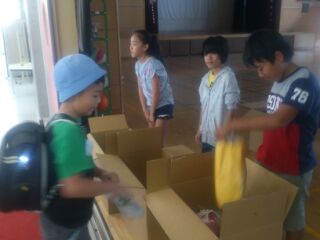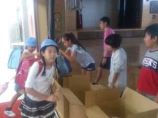5・6年生は、1学期に世界の難民の状況について学び、下級生に服の提供を呼びかけるポスターを夏休みに作成しました。