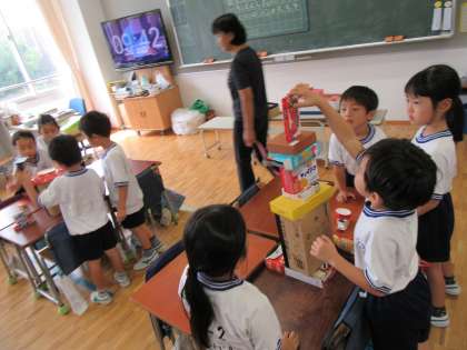 お家から持ってきた箱を、グループで「どう積み上げたら高くできるか」を考えました。