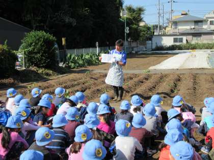 農園の「グッチーさん」からさつまいもの掘り方の説明を聞いて、いよいよさつまいも掘りのスタートです。