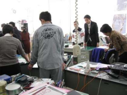 写真(上)----4月1日恒例。職員室の机移動の様子です。