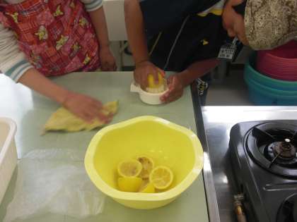 8等分したレモンをカップに入れて、みんなで「いただきまーす!!」