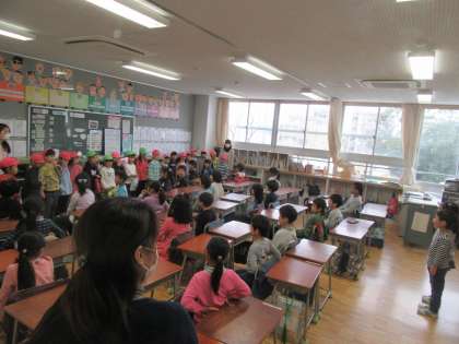 桜小1年生の教室にぴっころ保育園と桜新町保育園の子どもたちが見学に来てくれました。