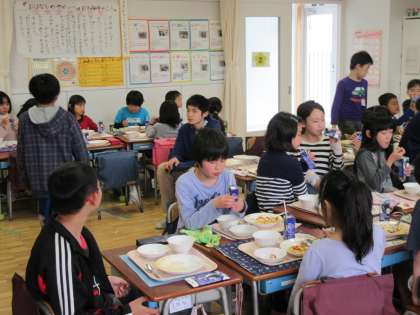 お世話になった6年生のために1年生から5年生で協力して給食の準備をしました。