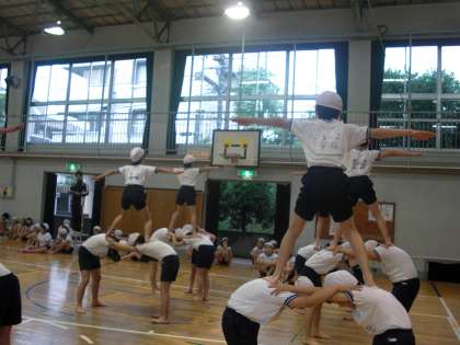 音楽に合わせて、一人技→二人技→三人技の練習をしました。