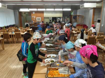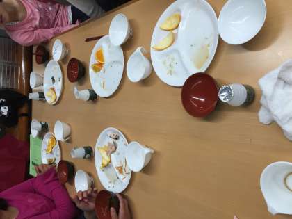 朝食が終わりました。ごはん、鮭、筑前煮、青菜のおひたし、オレンジ、のむヨーグルトを美味しくいただきました。
