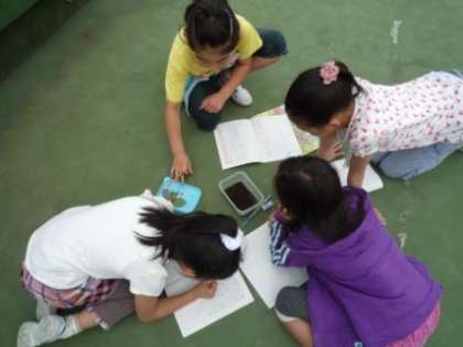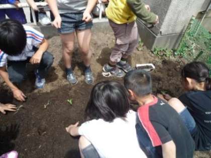教室で育てていた苗を植え替えたり(右の写真)、虫の観察をしたり(左の写真)しています。