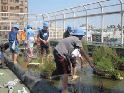子どもたちはビオトープが大好きです。お天気のよい日には、網を片手に池に入り、生き物を一生懸命探しています。
