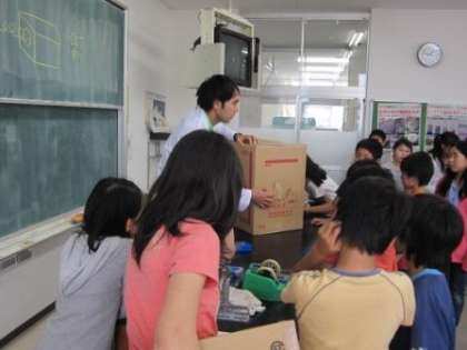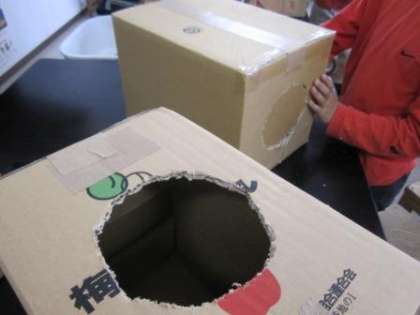 段ボールに穴を開け、両手で横をたたくと・・・勢いよく空気が飛び出しました。何度もたたいて、楽しむことができました。