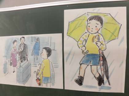 2年生は「とつぜんの雨ふり」というお話を読み、自分が家族の役に立ててうれしかったことを考えました。