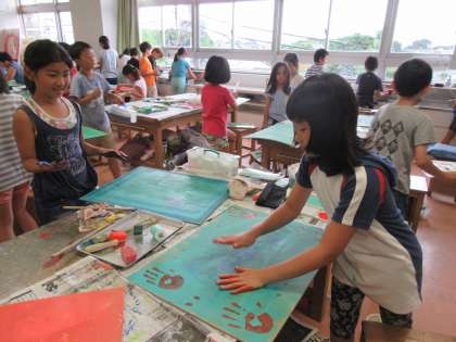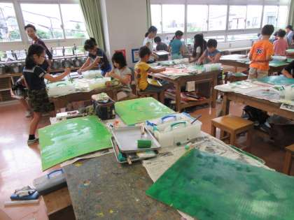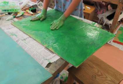 筆は使わずにスポンジを使ったり、ローラーを使ったり、手を使ったり・・・