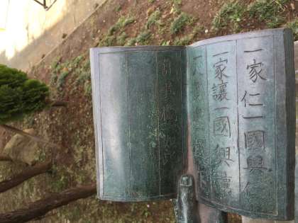 本校の金次郎像は、そんなに高いところではないので本を覗き見てもよいですが、十分に気を付けてください。