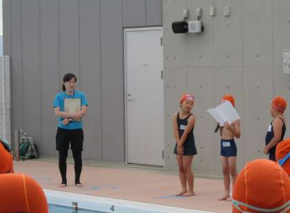 各クラスの代表の児童が今年のめあてを発表し、安全に水泳学習ができるように、全員で水泳学習のルールを確認しました。