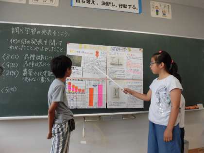 社会科で、米作りについて課題を決めて班ごとに調べ学習をしています。