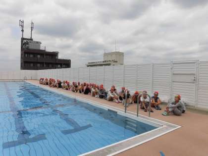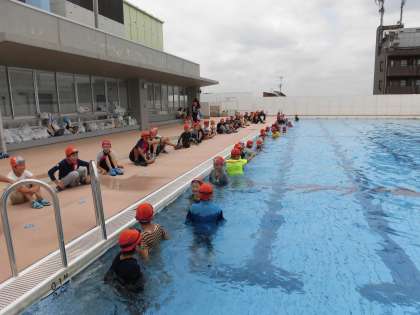 子どもたちには、服を着た状態で泳ぐとどれだけ体力を使うか、また、どのようにしたら体力をなるべく使わず温存できるか、歩いたり泳いだりして体験しました。