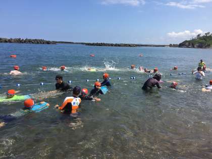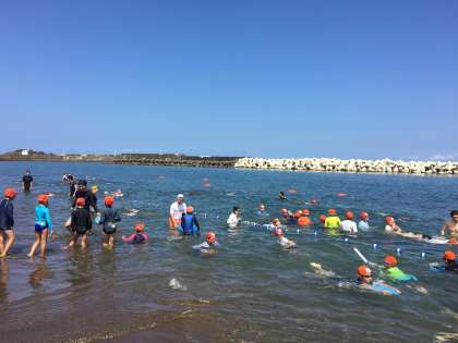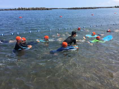 二回目の休憩が終わり、3回目の海泳ぎに入ったところです。海に入ると陸に上がっても快適で、絶好の海水浴日和です。全員が、自身のめあてに向けて練習に励んでいます。