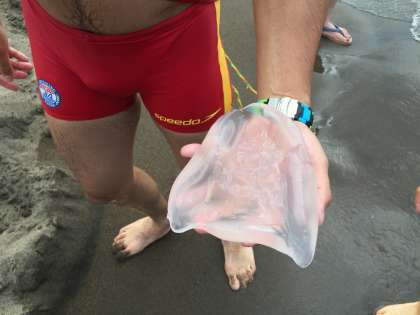 午後の海泳ぎが始まりました。相変わらず強い陽射しです。越前クラゲがいました。越前クラゲは刺さないので安全です。