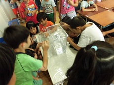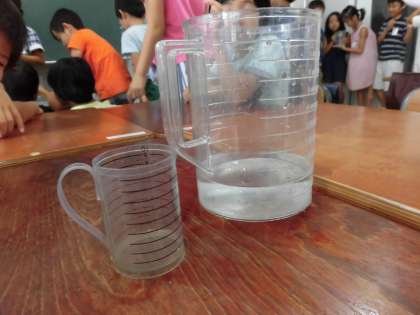 L(リットル)やdL(デシリットル)の単位を学習し、色々な容器にどれくらいの水が入っているかを調べたり、水をはかりとったりしながら水のかさについて学習をしています。
