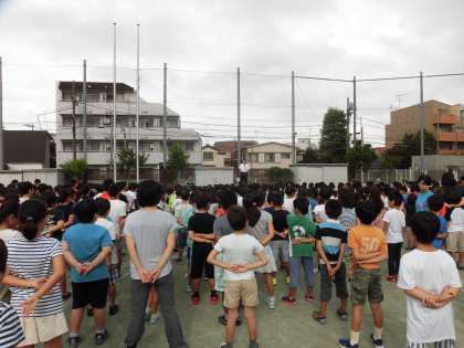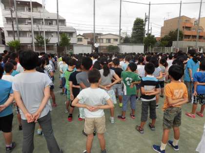 朝は全校朝会があり、校庭で全学年学級の児童が整列をして、校長先生のお話を聞いたり、看護当番の先生から今週の生活目標を聞いたりします。