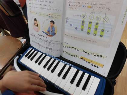 2年生の音楽では、今けんばんハーモニカを使って「ドレミであそぼ」という曲を弾いています。