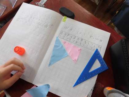 身近にある三角形や四角形を探したり、三角定規を上手に使いながら図形をかいたりしながら学習を進めています。