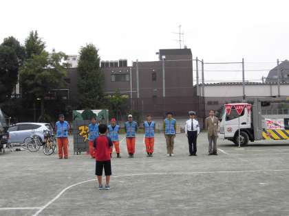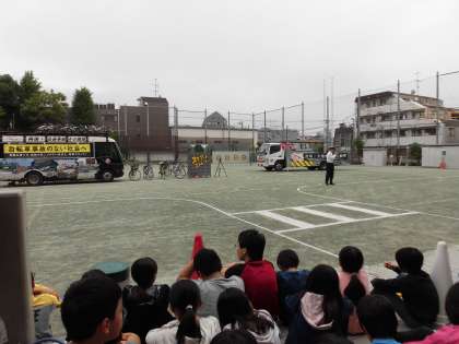 目の前で、実際にトラックや自動車に巻き込まれたり衝突したりする事故を実演していただき、子どもたちもその衝撃の大きなに驚くとともに、改めて事故の危険性や怖さを実感することができました。