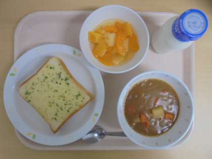 ☆10月17日(月)の給食の写真です。(ガーリックトースト 牛乳 ビーンズシチュー フルーツポンチ)