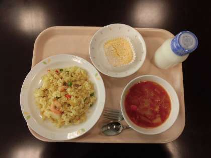 ☆10月21日(金)の給食の写真です。(パエリア 牛乳 ミネストローネ チーズケーキ)