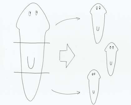 その後、校長先生は、プラナリアのことを調べました。おぼろげに切っても、切っても再生する生き物だったような気がしていたのですが、調べてみると、その通り、切っても、切ってもその部分から頭が生えてきて、再生していく生物でした。