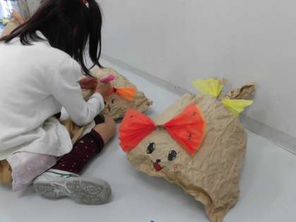 大きな自分で考えた「おともだち」をクラフト紙と新聞紙で作っています。