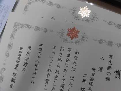 今日全校朝会で春に描いた消防写生会の絵の表彰がありました。
