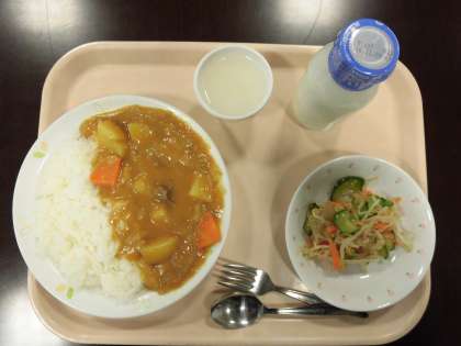 ☆11月2日(水)の給食の写真です。(カレーライス 牛乳 こんにゃくサラダ ホワイトゼリー)