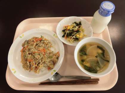 玉ねぎや豚肉を卵でとじた「開化丼」が出ました。なじみのないメニューでしたが、「食べてみたらおいしかった」と子どもたちが言ってくれました。
