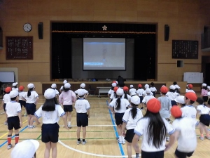 記録を伸ばすために、紹介された運動の「くまもん体操」をみんなで踊りました。