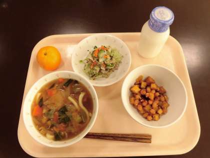 ☆11月25日(金)の給食の写真です。(カレーうどん 牛乳 大豆と薩摩芋の甘辛揚げ 野菜のゆかりかけ みかん)