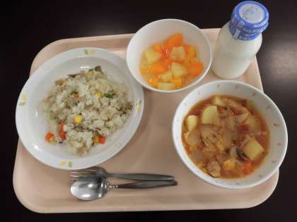 ☆12月5日(月)の給食の写真です。(鶏ごぼうピラフ 牛乳 ボルシチ フルーツポンチ)