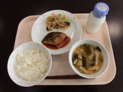 ☆12月6日(火)の給食の写真です。(ごはん 牛乳 さわらのバーベキューソース 和風サラダ 油揚げと大根のみそ汁)