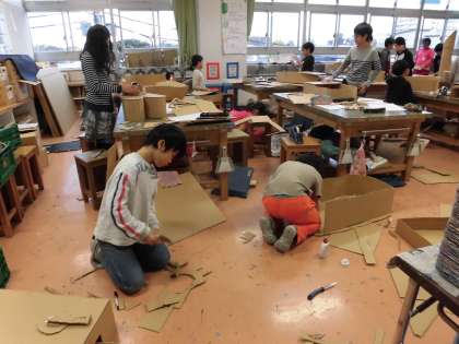 段ボールカッターを使っているので、「手が疲れた〜〜!!」と言いながらも、夢中で取り組む子どもたちです。