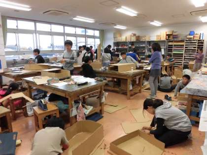 大きな段ボールを、切ったり、丸めたり、捻ったりと様々な作業をして、オリジナルの宇宙船作りを目指します。