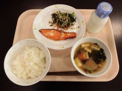 ☆12月20日(火)の給食の写真です。(ごはん 牛乳 鮭のゆうあん焼き 野菜ののり和え かぼちゃと厚揚げのみそ汁)