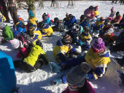 いよいよ開講式です。スキー学校の校長先生があいさつをしていよいよ班に分かれます。