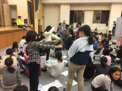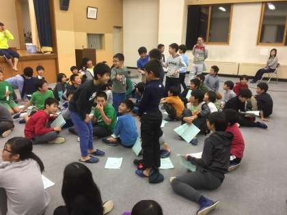 スタートは、班対抗ジェスチャー当てゲーム。お題は、スポーツと動物の2種類でした。