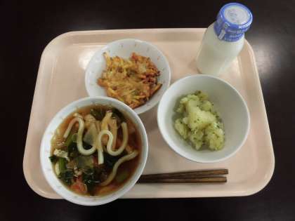 ☆1月19日(木)の給食の写真です。(五目うどん 牛乳 かきあげ 青のりポテト)