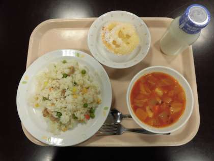 ☆1月20日(金)の給食の写真です。(三色ピラフ 牛乳 ミネストローネ 洋梨のケーキ)