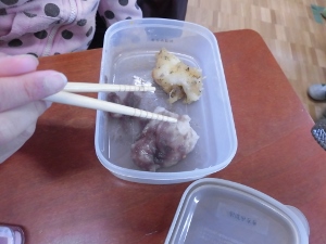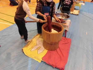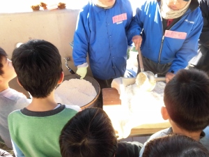 桜小で、寒餅会が始まった理由を事前に紙芝居で学習し、当日もお米が餅になる過程を見学させてもらいました。