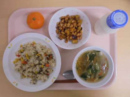 ☆1月23日(月)の給食の写真です。(豚肉と高菜のごはん 牛乳 春雨スープ 大豆と薩摩芋の甘辛揚げ みかん )