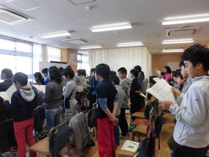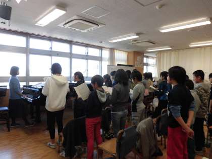 新しい音楽の先生による、授業では卒業式の合唱練習を行っています。