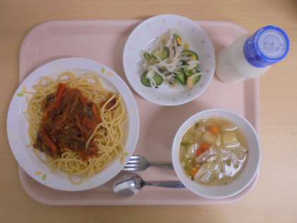 スパゲッティナポリタンを食べて、口の周りがソースで赤くなっている子を多く見ました。みんなおいしそうに食べてくれました。
